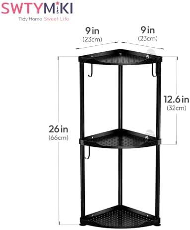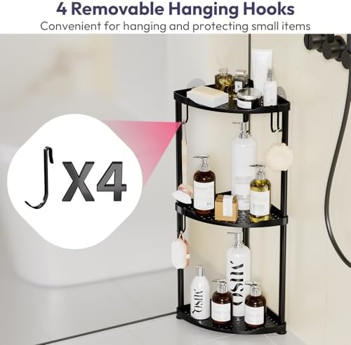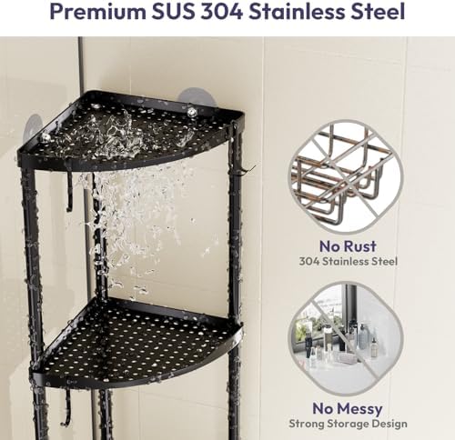 SWTYMIKI Corner Shower Caddy Standing - 3 Tier Stainless Steel Shower Organizer Stand, Large Capacity Floor Shelf with 4 Hooks, Rustproof Bathroom Storage Rack, Black