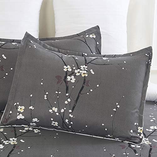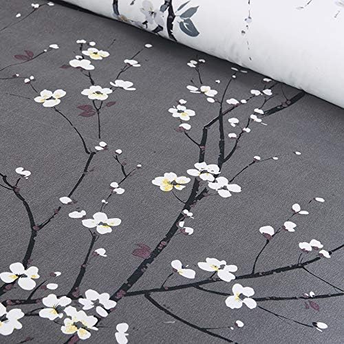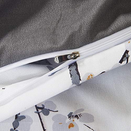YEPINS Soft Brushed Microfiber Duvet Cover Set with Zipper Closure and Corner Ties, Plum Blossom Branch Floral Printed Pattern, Grey and White Color, Reversible Design- Queen(90x90 inches)