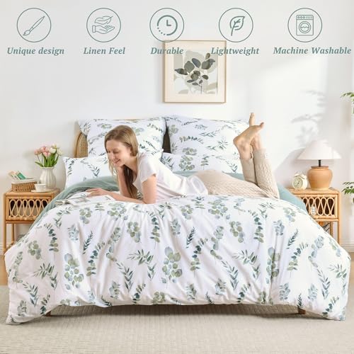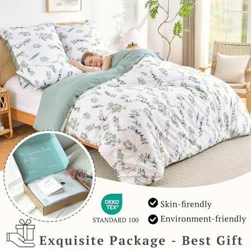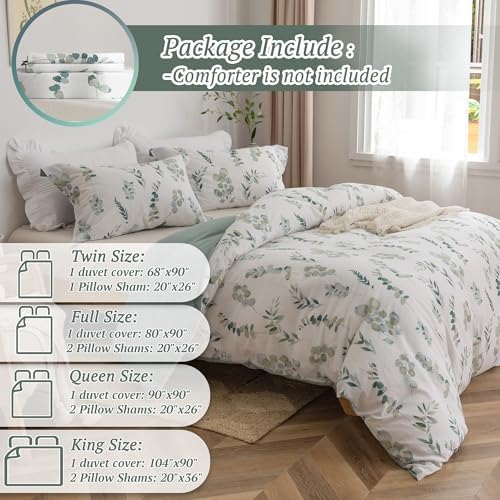 MILDLY Down Duvet Cover Medium Double Bed -100% Water Washed Cotton Grey Green Eucalyptus Double sided Flower Down Duvet Cover 3-Piece Set with Zipper Sealing Corner Lace