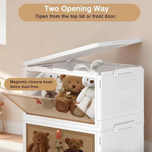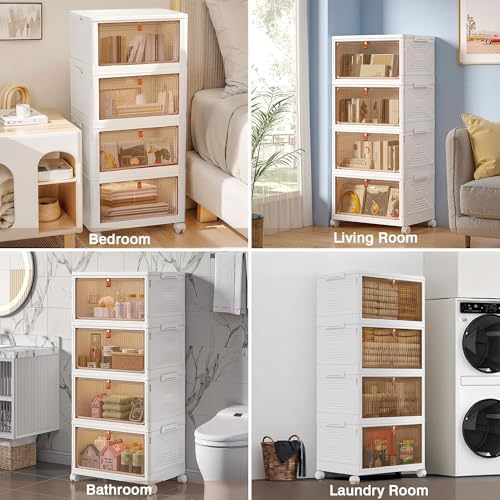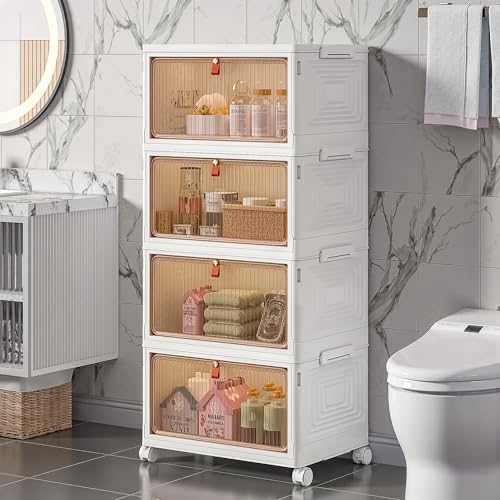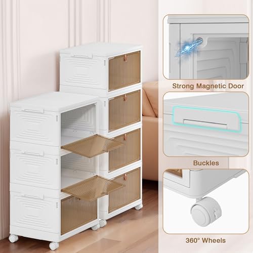VECELO 4 Tier Storage Bins with Lid, Stackable Storage Boxes with Magnetic Doors & Wheels, Foldable Storage Containers, 23 QT Closet Organizers and Storage for Living Room, Office, Dorm