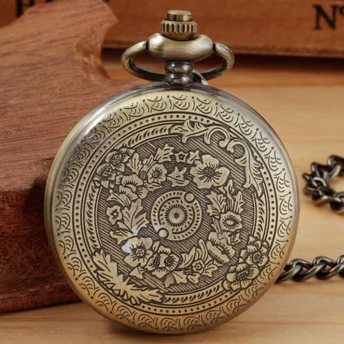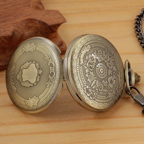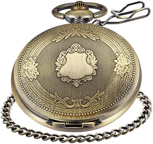 Realpoo Bronze Smooth Cover Roman Men's Quartz Pocket Watch, Black Roman Digital Dial with Chain