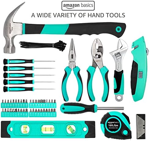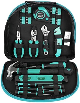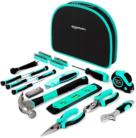 Amazon Basics Tool Set With Easy Carrying Round Pouch, 104-Piece, Turquoise, 14.4 x 11.4 x 3 inches