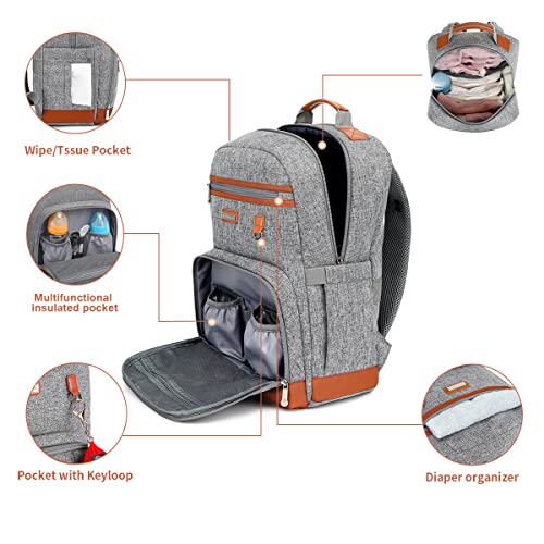 BILLITON MASHI Diaper Bag Backpack, Large Baby Nappy Bags with Portable Changing Pad for Boys and GirlsMultifunction Travel Baby Bag for Moms Dads, Shower Gifts Waterproof and Stylish,Grey