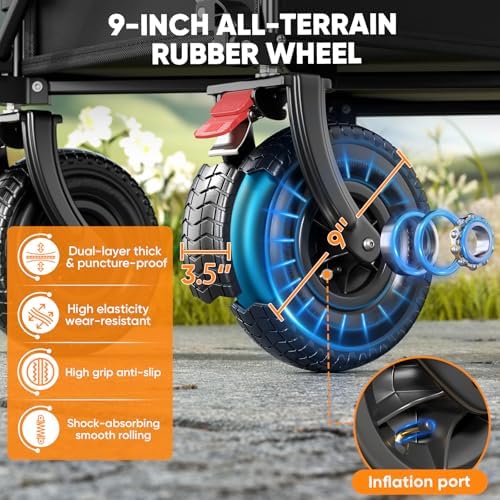 Beach Wagon with 9x3.5" Big Rubber Wheels for Sand, 350lbs Heavy Duty 200L Collapsible Utility Wagon, Easy Transport & Storage, Ideal for Sport, Camping, All-Terrain Outdoor Activities, Black