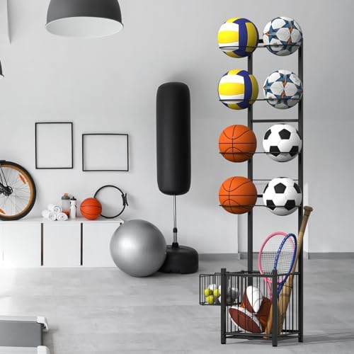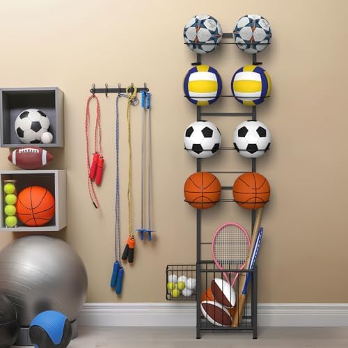 CADUKE Basketball Storage, Vertical Ball Rack for Garage, 8 Balls Sports Ball Holder for Basketball, Soccer, Volleyball, Football, Rackets in Garage, Indoor, Outdoor, Black