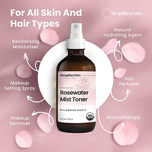 Rose Water Spray for Face & Hair - Organic USDA Certified Rosewater Facial Toner - Alcohol-Free Makeup Setting Hydrating Face Mist - Anti-Aging Toner Spray - 4 Oz