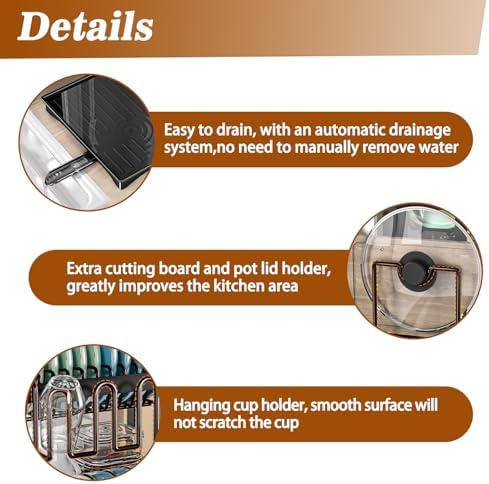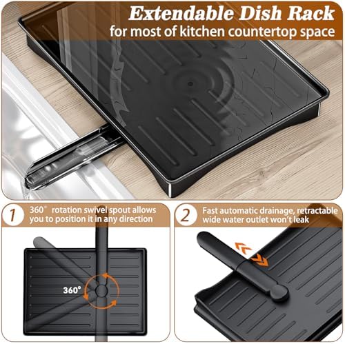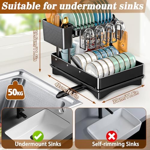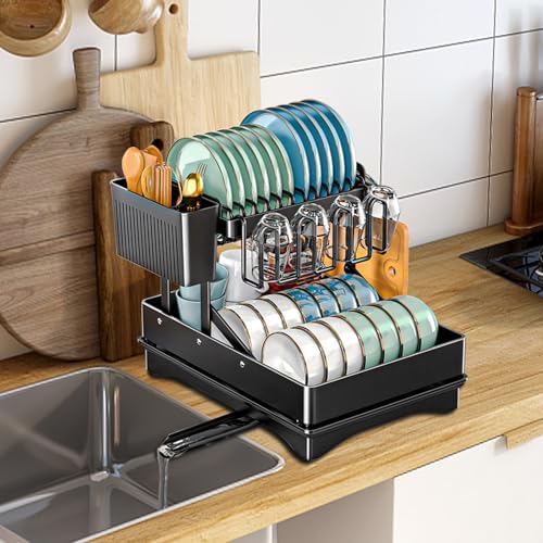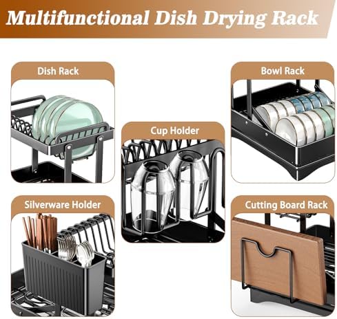BYTANA Rust-Proof Dish Drying Rack, 2 Tier Large Dish Rack for Kitchen Counter, Carbon Steel Detachable Dish Drainer Organizer with Utensil Holder and Drainboard 16.5 x 11.8 x 11.6 in, Black