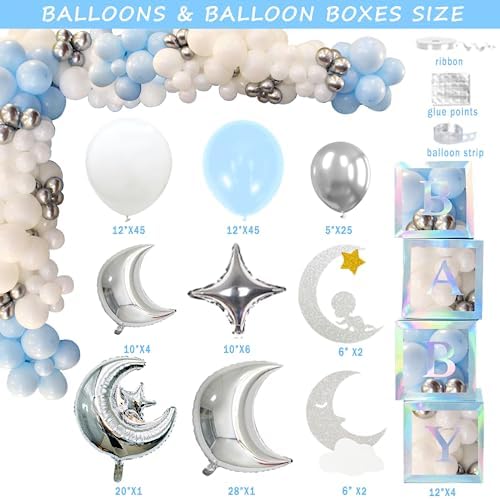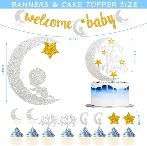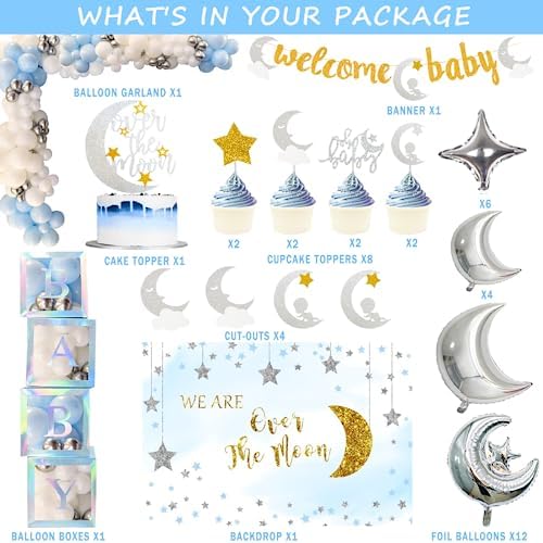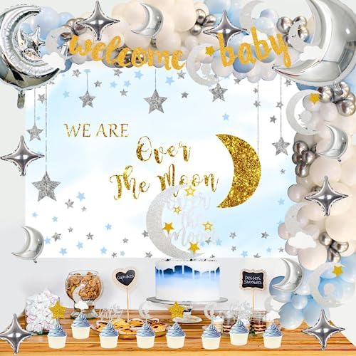 154 PCs Over The Moon Baby Shower Decorations, Fiesec We Are Over The Moon Baby Shower Decorations Backdrop Balloon Garland Glitter Banner Cake Cupcake Topper Boxes Cutout Starry Night Galaxy Sliver