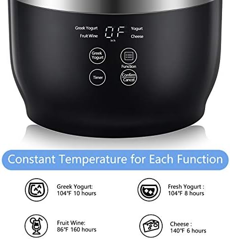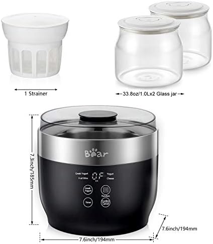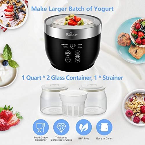Bear yogurt machine, Greek yogurt machine with filter and timer control, stainless steel inner pot, automatic digital with glass jar, quart, suitable for home organic yogurt, cheese, fruit wine