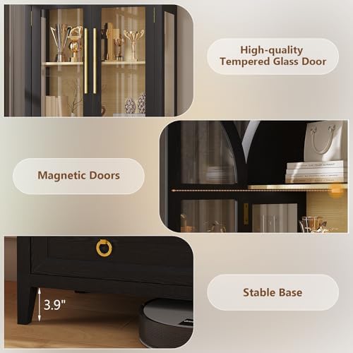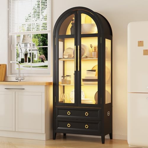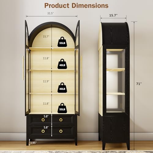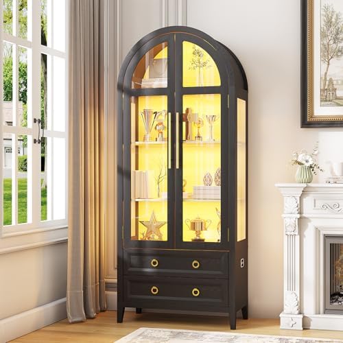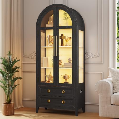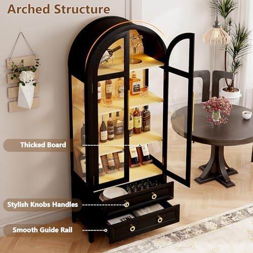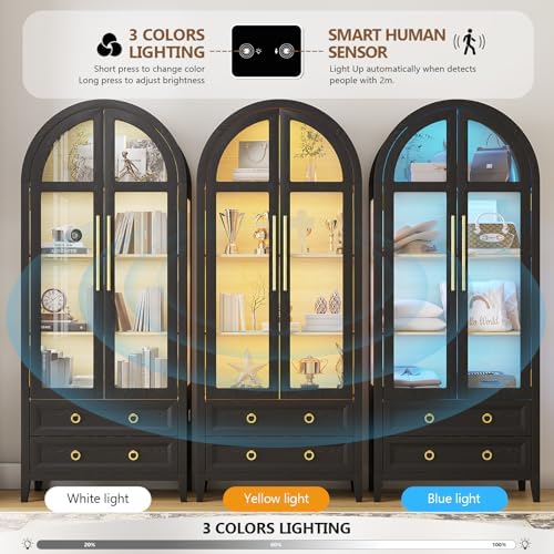 LVSOMT 71" Tall Arched Storage Cabinet with Glass Doors and Drawers, Curio Display Cabinet with Adjustable LED Light & Human Sensor, 4-Tier China Cabinet for Living Room(Black+Wood)