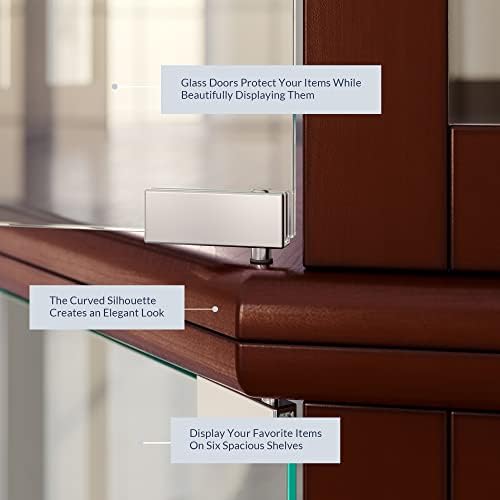 BELLEZE Lighted Corner Display Curio Cabinet,72" Tall Wooden Curved Shelving Unit with Tempered Glass Door, Bar and Liquor Storage Area with 6 Shelves - Ashfield (Walnut)